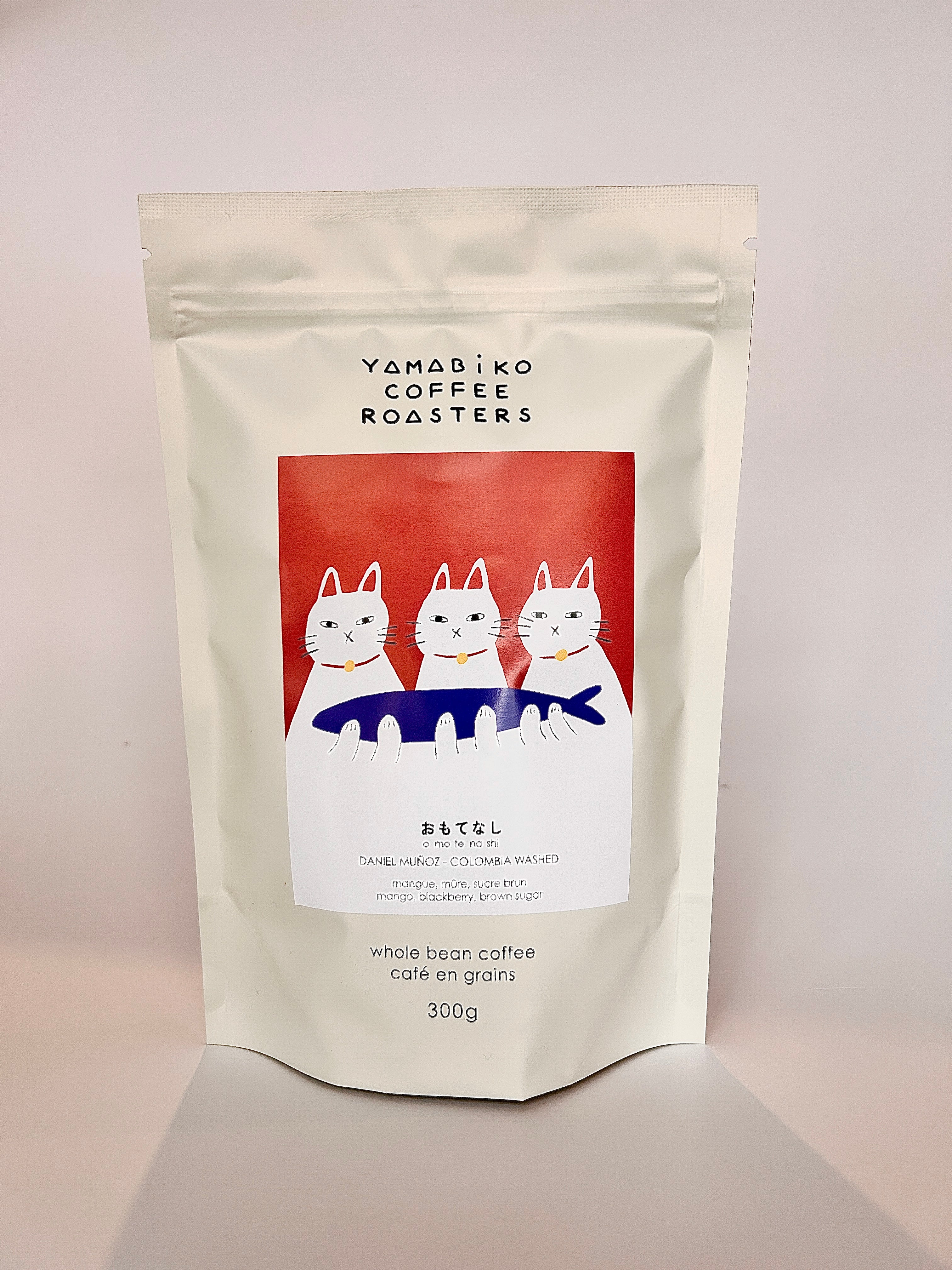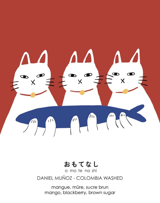 Omotenashi means to wholeheartedly look after your guests! This coffee is all about sharing something very special with our guests. The concept behind the artwork is that the 3 cats are presenting you with their prized possession, a fish. In our case - Omotenashi is the prized possession.